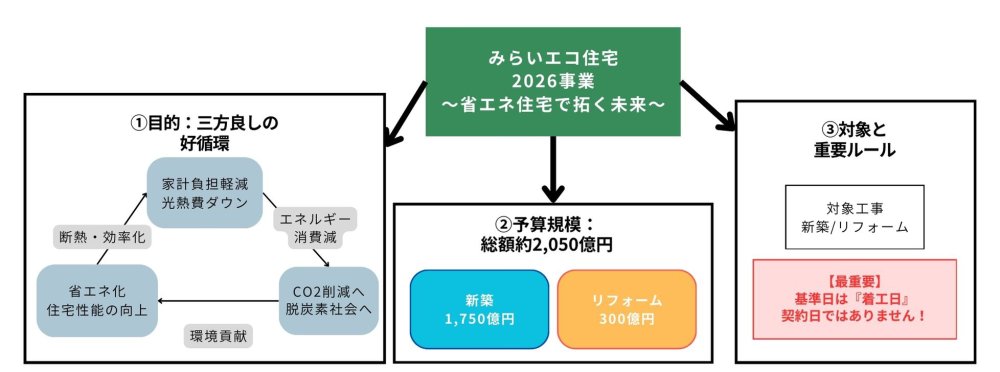 「みらいエコ住宅2026事業」は、省エネ性能の高い家を建てたり、リフォームする人を国が補助金で応援する制度です。