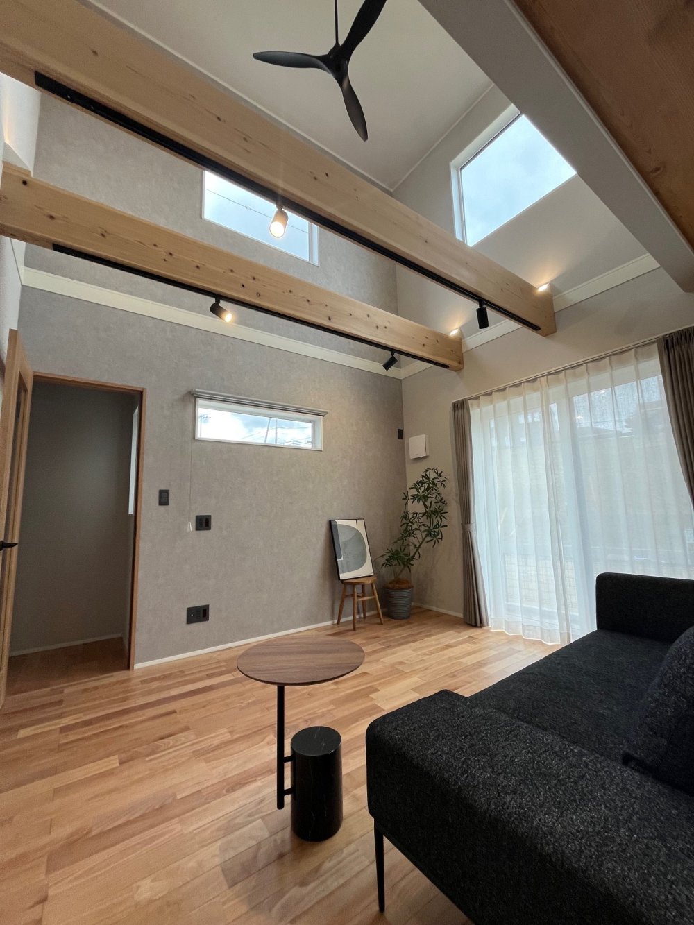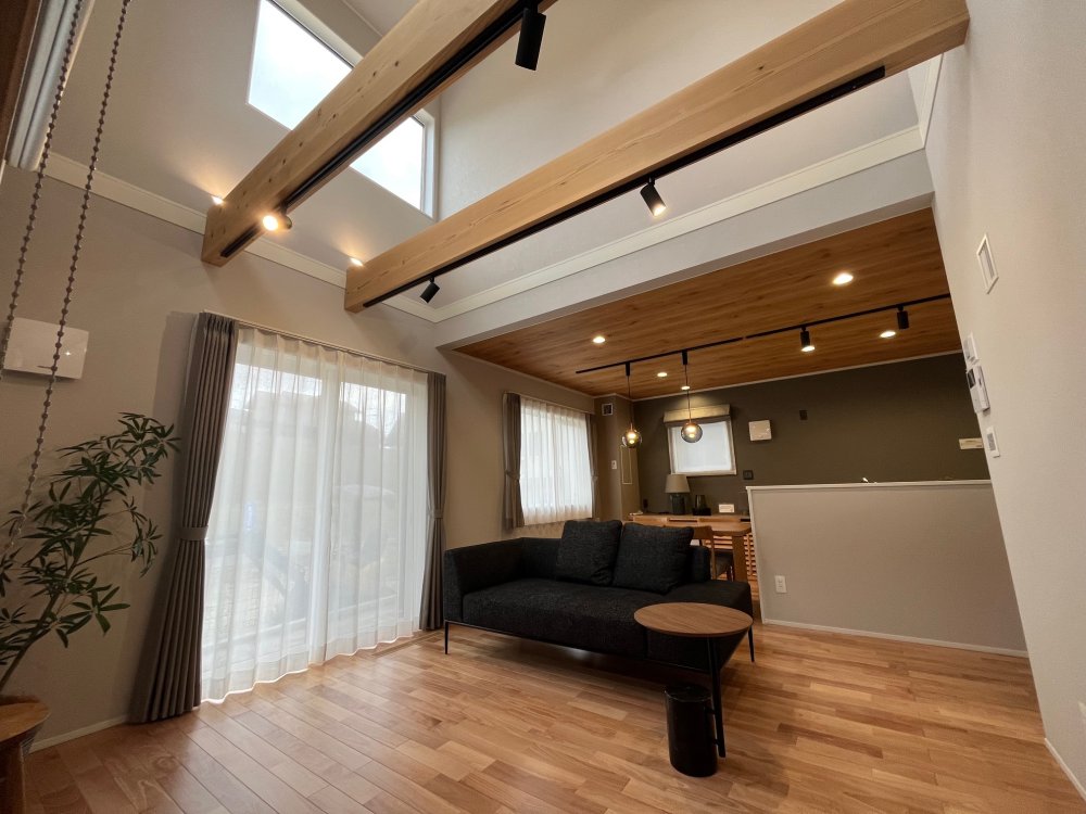 リビングの天井を見上げると現れるのが、無垢の梁をあえて見せた吹き抜け空間。