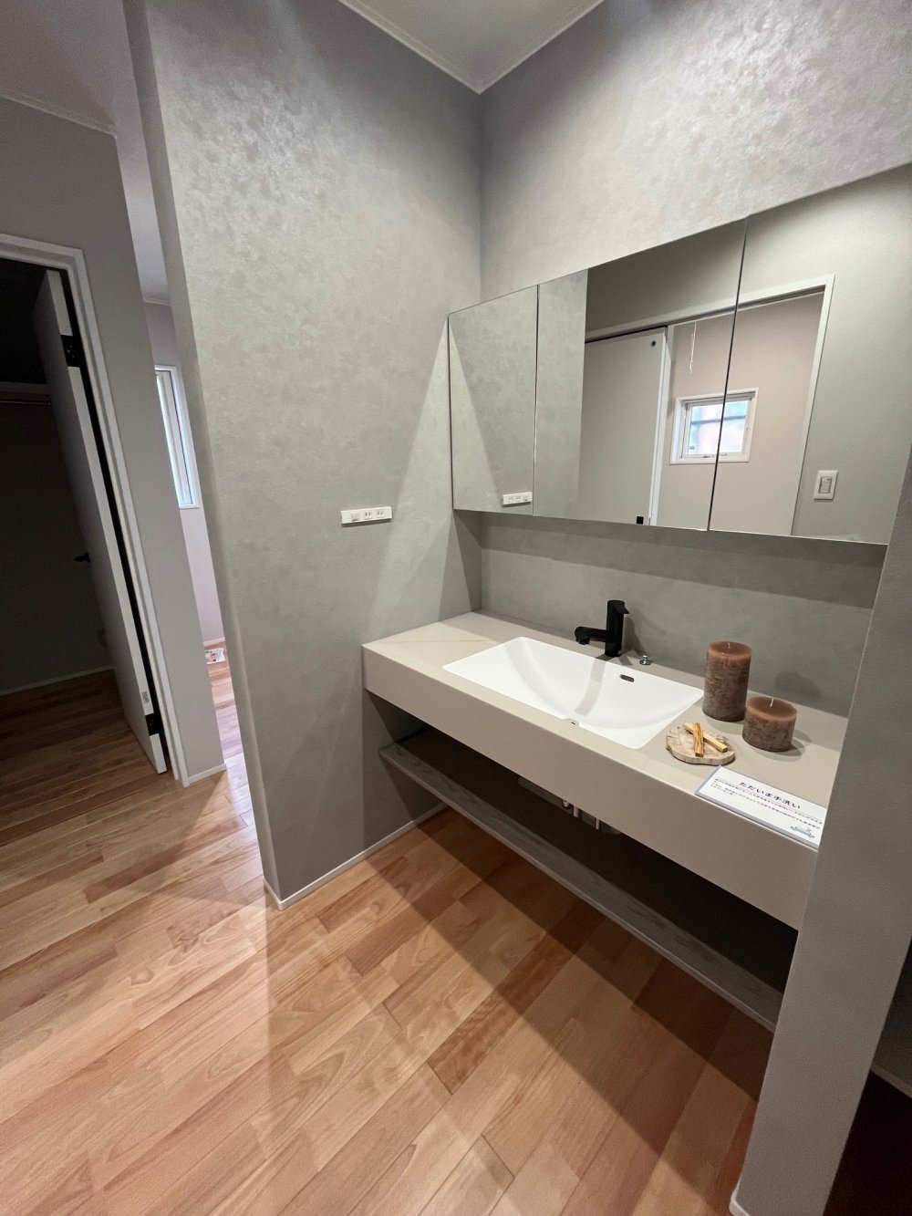 リビングから直接アクセスできる洗面室は、家族が帰宅後すぐに手洗いできる衛生的な設計。
