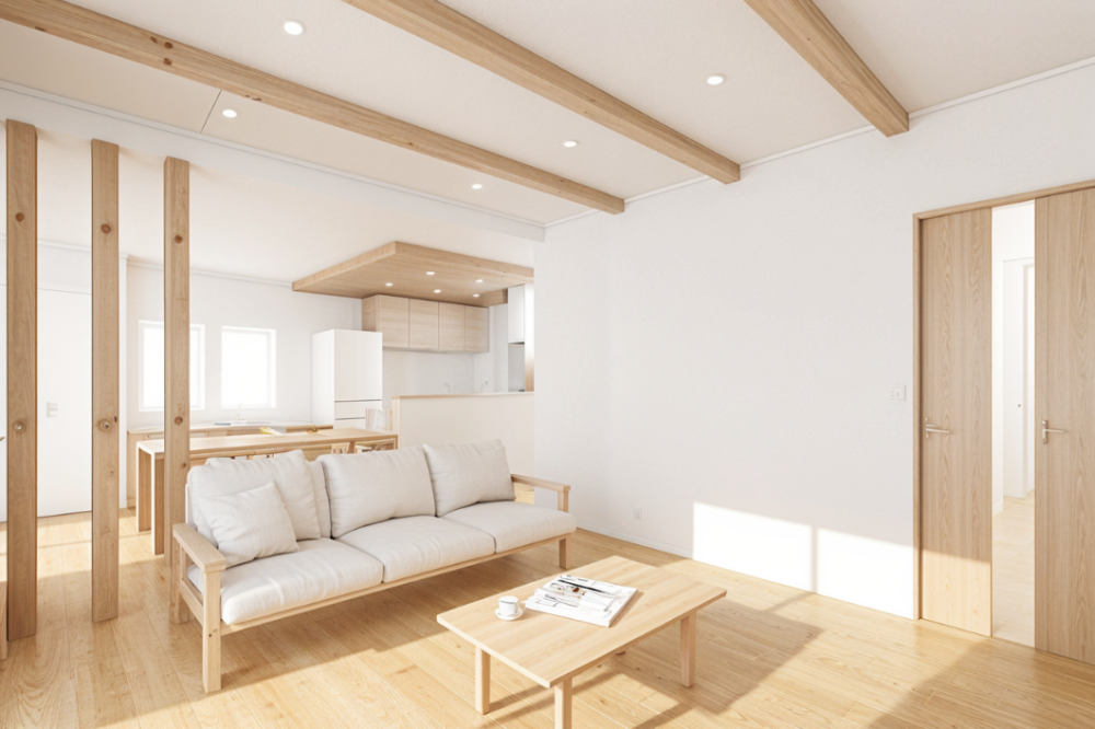 リビングでは天井の梁あらわしと、空間を支える3本の柱を。