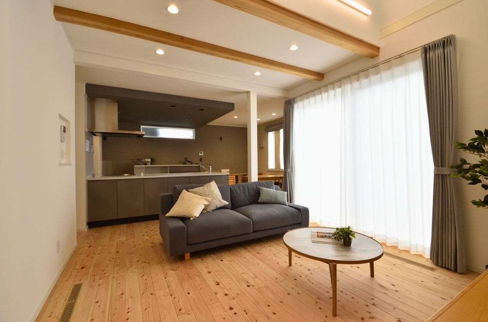 リビングには大空間を演出する 吹き抜け構造 が採用され、2階まで続く窓から明るい自然光が差し込みます。