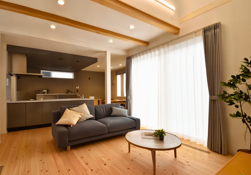 福浦街かどモデルハウスの見どころは、リビングに入った瞬間に広がるダイナミックな勾配天井と木の温もりあふれる梁あらわしによる解放感。