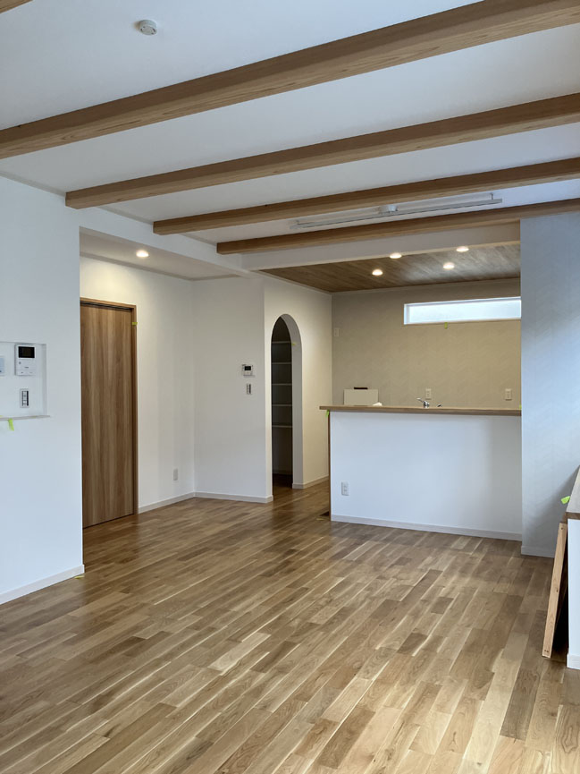 現場内では、リビングや各居室の仕上げが進み、温かみのある空間が完成に近づいています。大きな窓から自然光が差し込み、明るく居心地の良い雰囲気です。