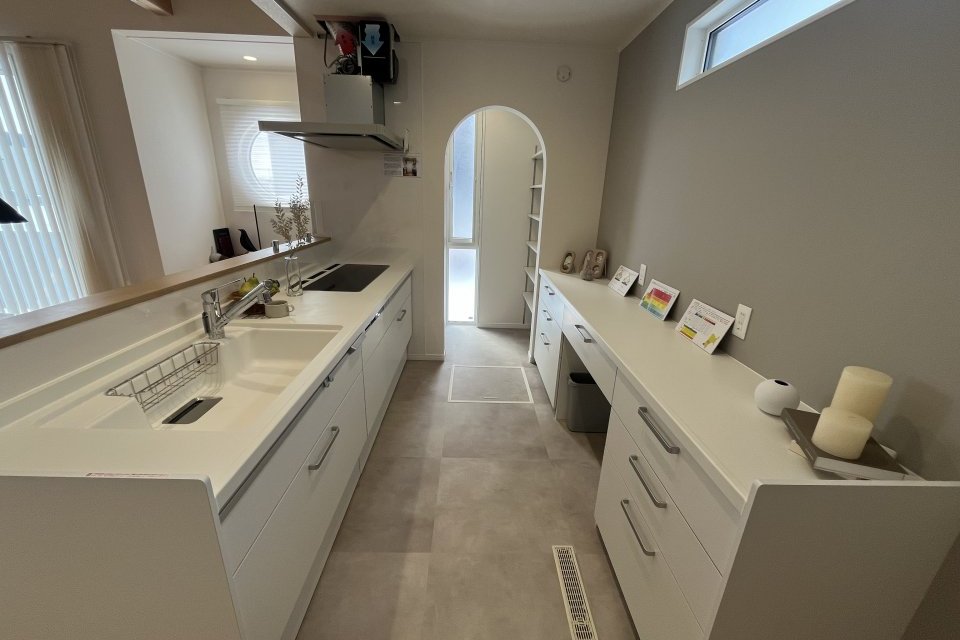 背面収納やパントリーへも近く、見た目の美しさと使いやすさを両立した、暮らしに寄り添うキッチン空間です